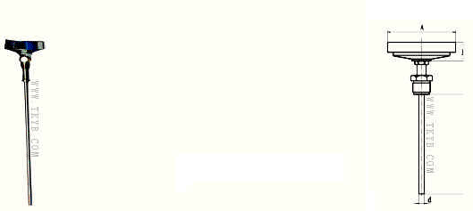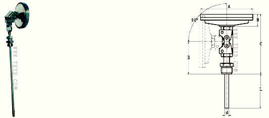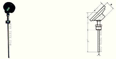 例A:万向型双金属温度计,表盘直径100,测温范围0-400℃,1.5级,活动外螺纹 M27x2,长度450mm,WSS-481,0-400℃,L=450mm,M27x2