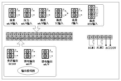 无补偿输入,通讯方式RS232,继电器输出,流量输入类型4~20 mA,第一报警为上限报警,第二报警为下限报警,单路DC 24V馈电输出,AC 220V供电。