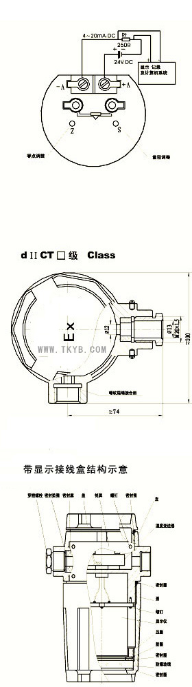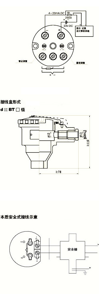 6、输出信号: 4-20 mA ,负载电阻250,传输导线电阻 100